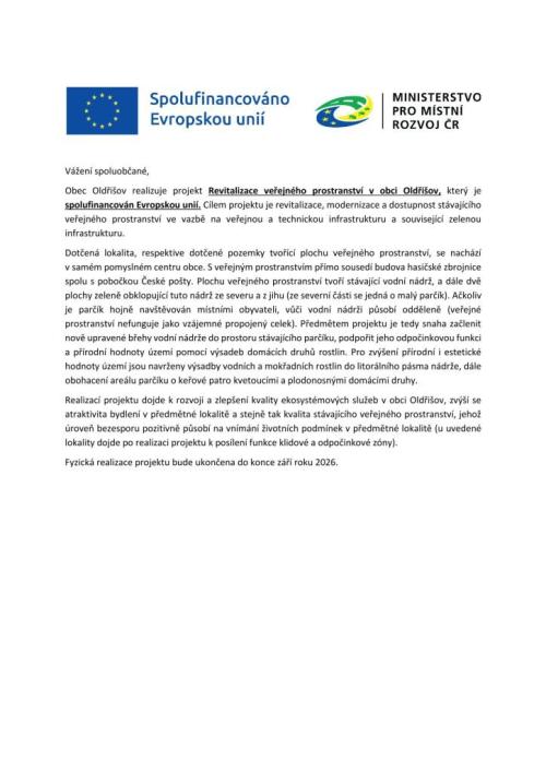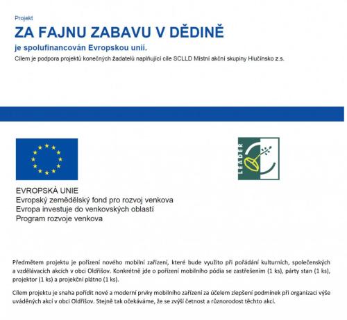 PROJEKT: "Oprava kapličky sv.Antonína v Oldřišově". Projekt „ Oprava kapličky sv.Antonína v Oldřišově “ je spolufinancován z programu MMR "Podpora obnovy a rozvoje venkova 2015" ve výši 70% uznatelných nákladů.